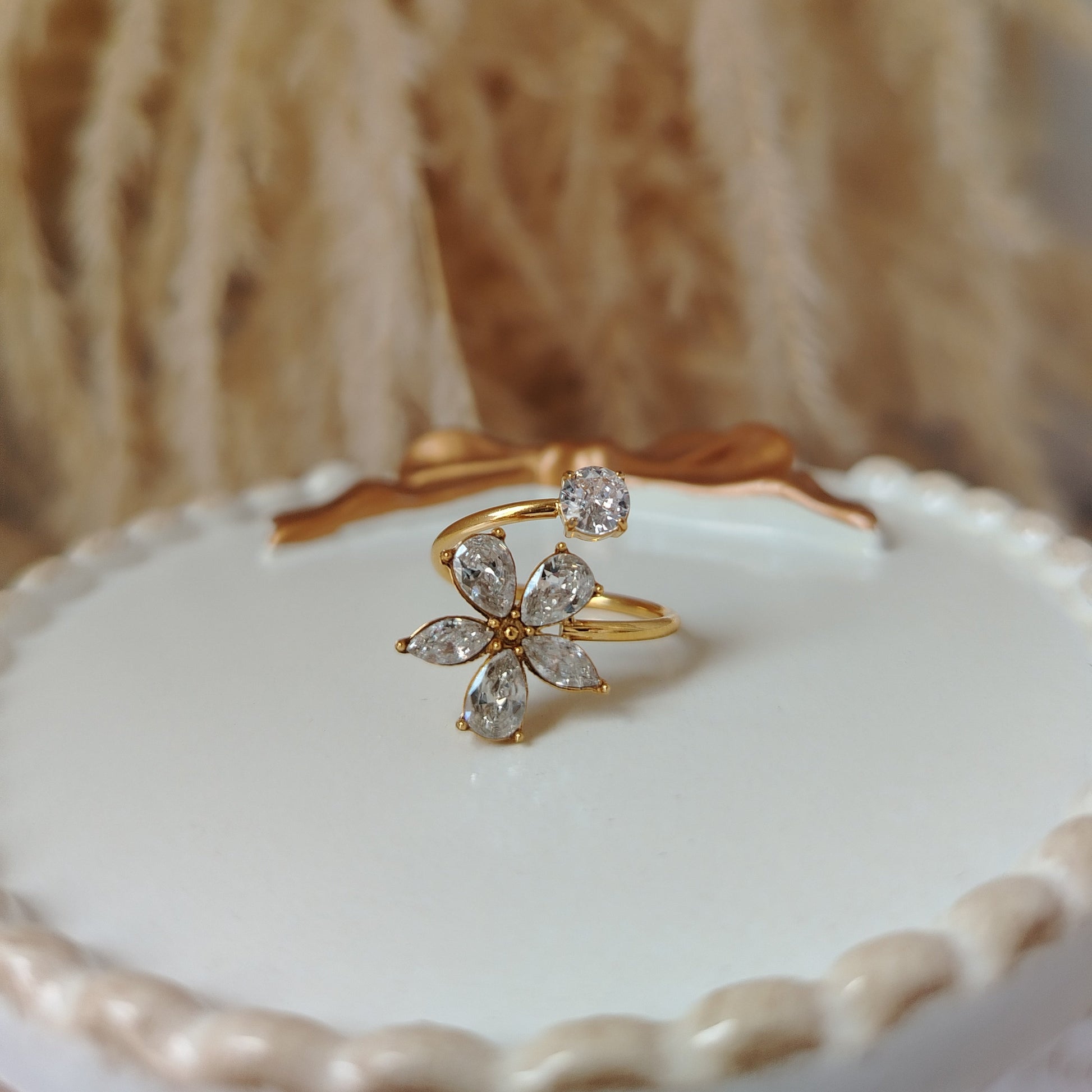 Anillo dorado elegante de acero inoxidable chapado en oro de 18KL, diseñado para mujeres que brillan con luz propia. AURA es un símbolo de poder interior, ideal para elevar tu presencia y recordarte que mereces brillar cada día.