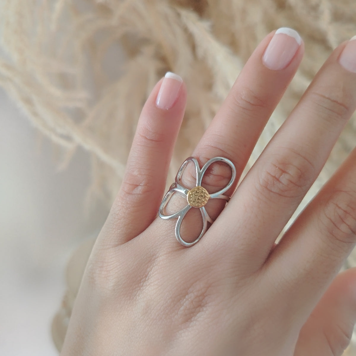 Un anillo que no pasa desapercibido. Su flor grande y delicadamente trabajada simboliza el florecer de una mujer segura de sí misma, que abraza cada etapa de su vida con valentía y amor propio. Perfecto para recordarte que tu belleza también nace desde adentro.