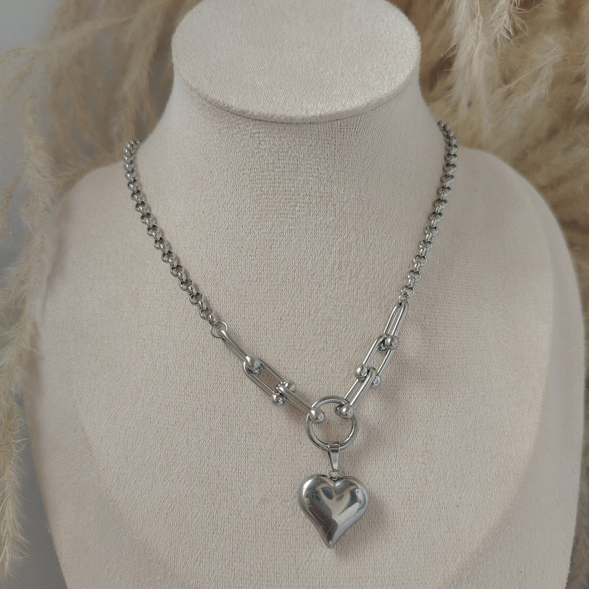 Este collar plateado con un corazón de dije grueso es ideal para mujeres con estilo propio, fuerza y sensibilidad.